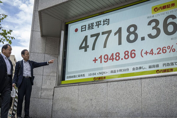 月曜日の東京株式市場は4%を超える急騰となり、過去最高値を更新した。一方で円は下落した。これは、日本の与党新総裁に選出された髙市早苗氏が、景気刺激のための大規模な金融緩和政策を進めるとの観測が広がったためである。 今月中…